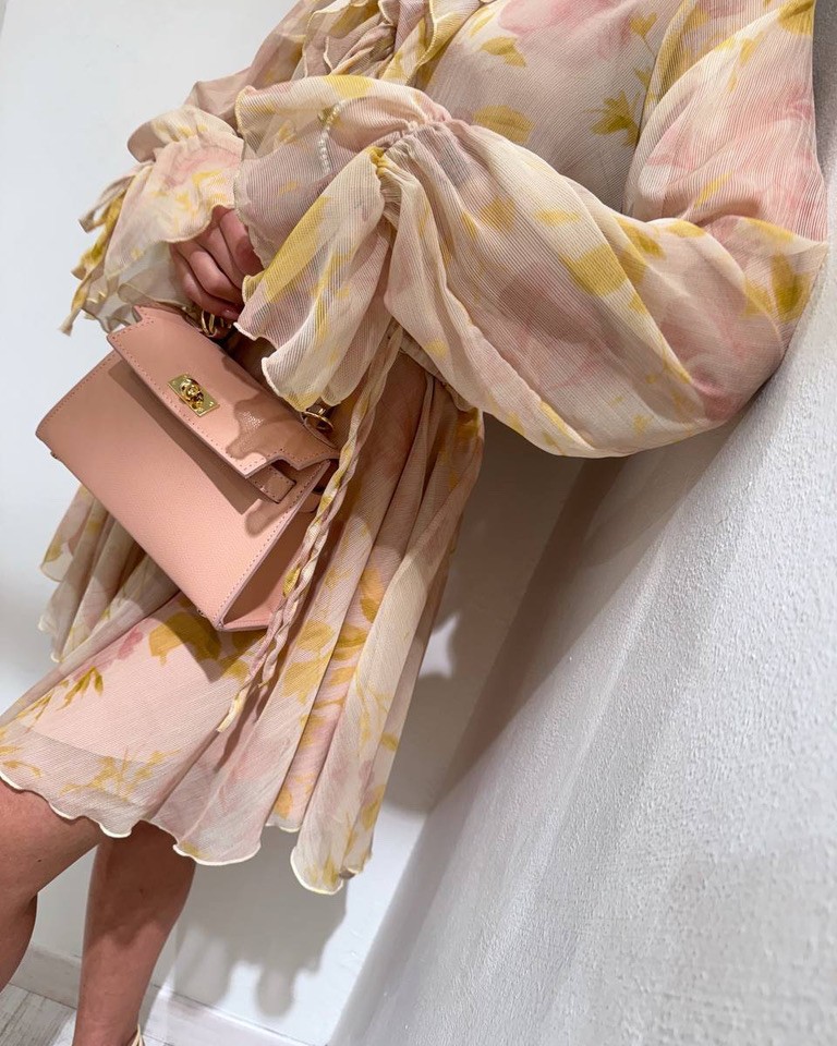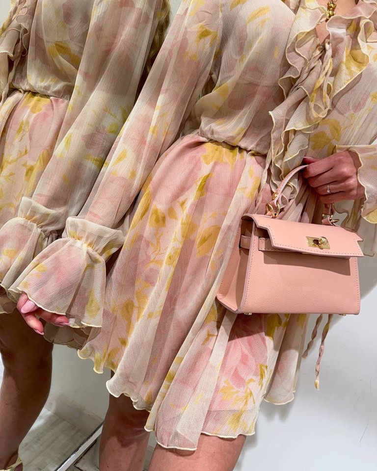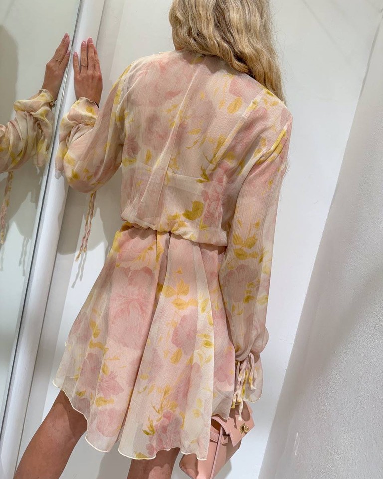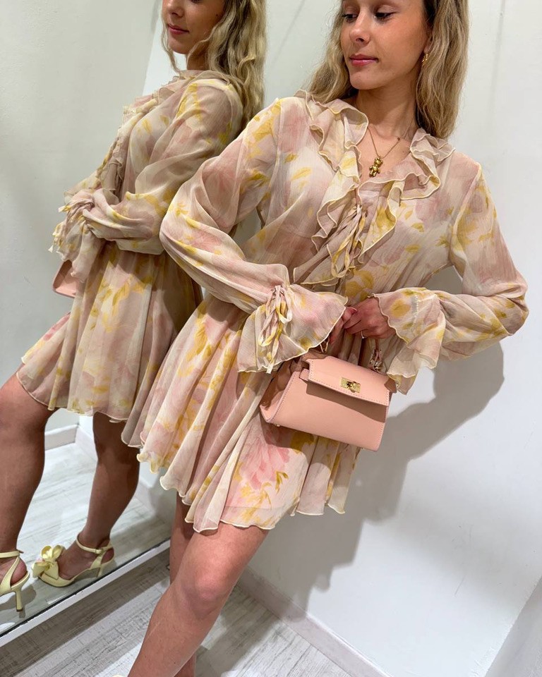 Vestito stampa floreale sui colori del pesca, giallo e rosa antico, modello corto, scollo a v con rouches e laccio, maniche lunghe con elastico e fiocco sul polso, parte superiore semitrasparente. Gonna con elastico in vita e sottogonna color rosa antico. Vestibilità regolare/morbida.