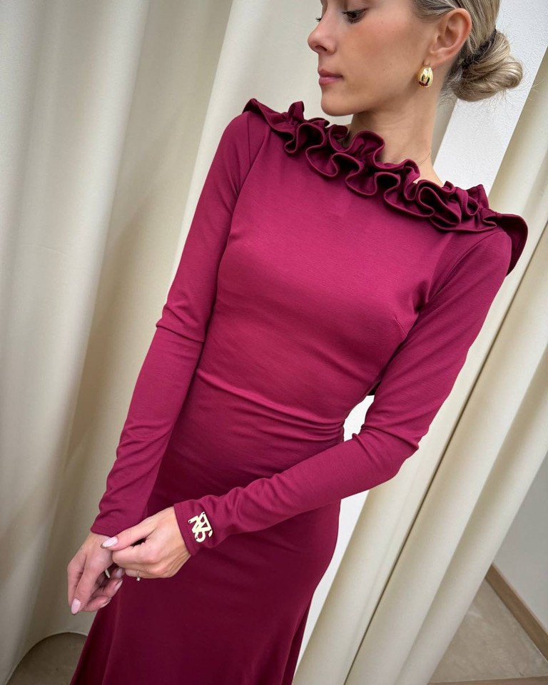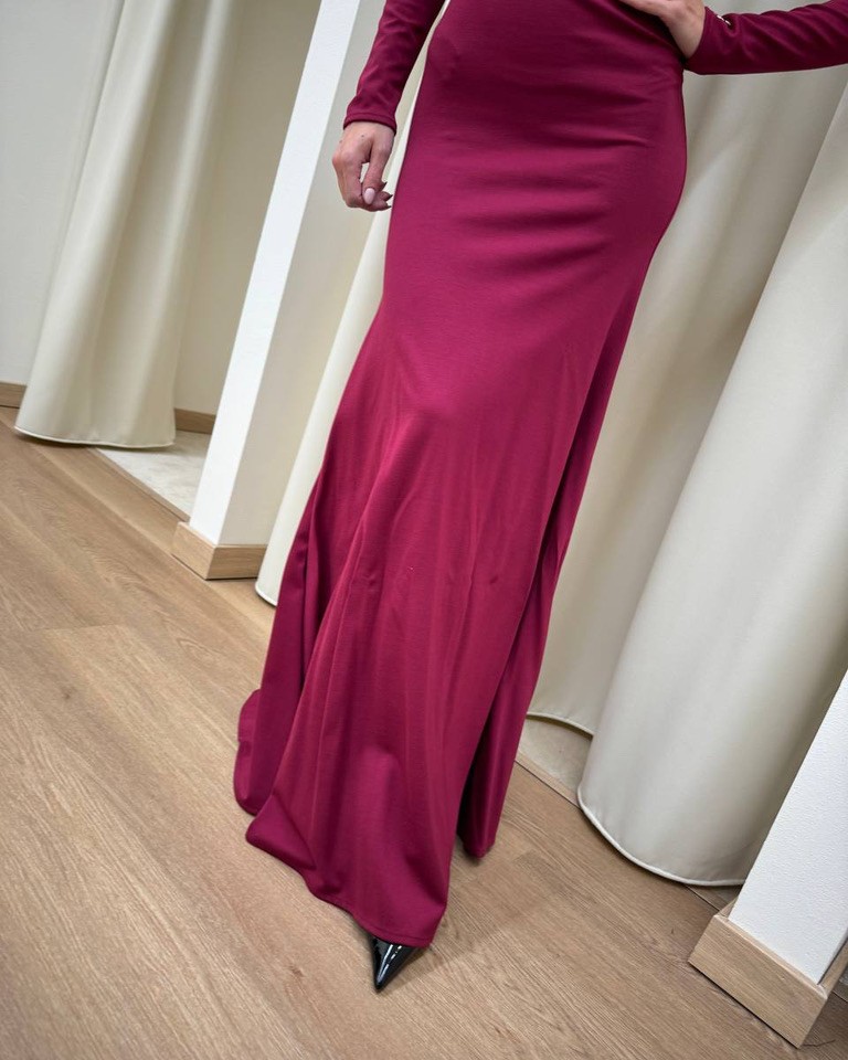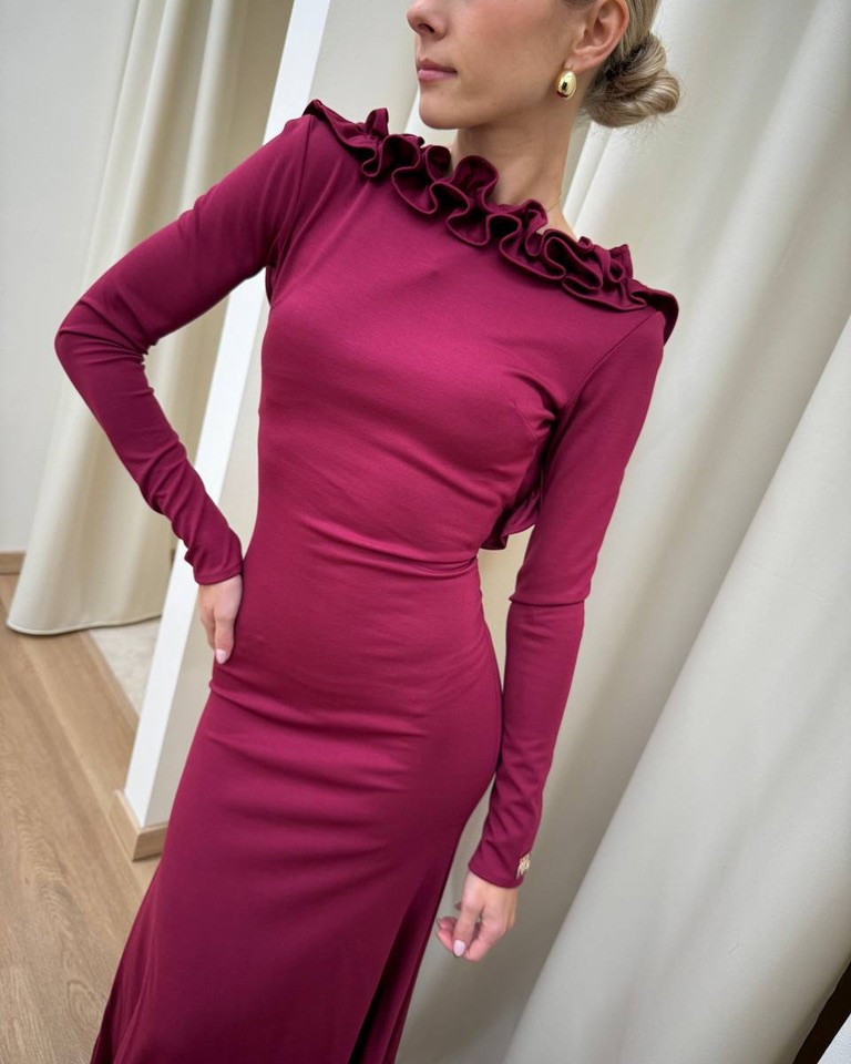 Vestito bordeaux in tessuto elasticizzato, modello lungo, maniche lunghe girocollo con schiena scoperta e rouches sui profili. Gonna svasata sul fondo. Drappeggio sul dietro con spacco. Vestibilità aderente.