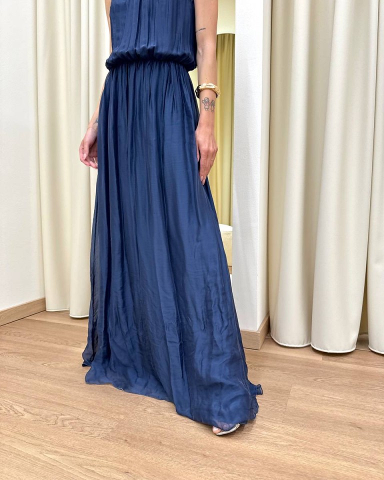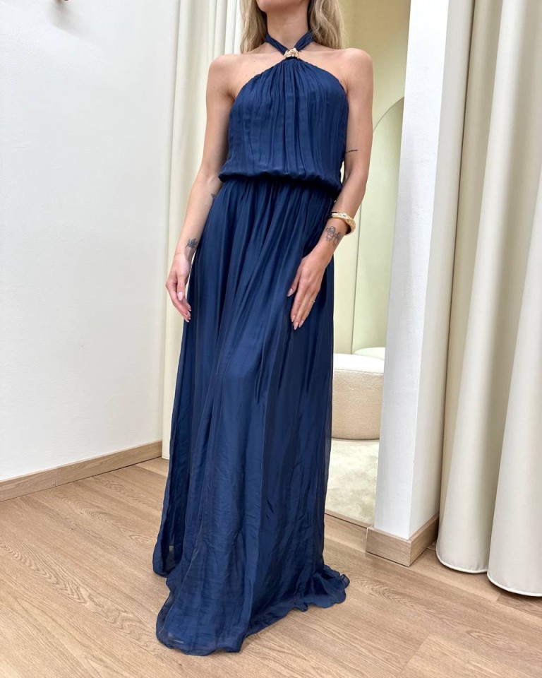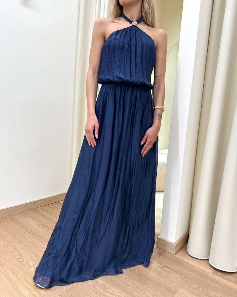 Vestito color blu navy, modello lungo, leggero, dritto, scollo all’americana con dettaglio gioiello dorato con nastro al collo dietro, schiena scoperta, arricciatura con elastico in vita. Vestibilità ampia.