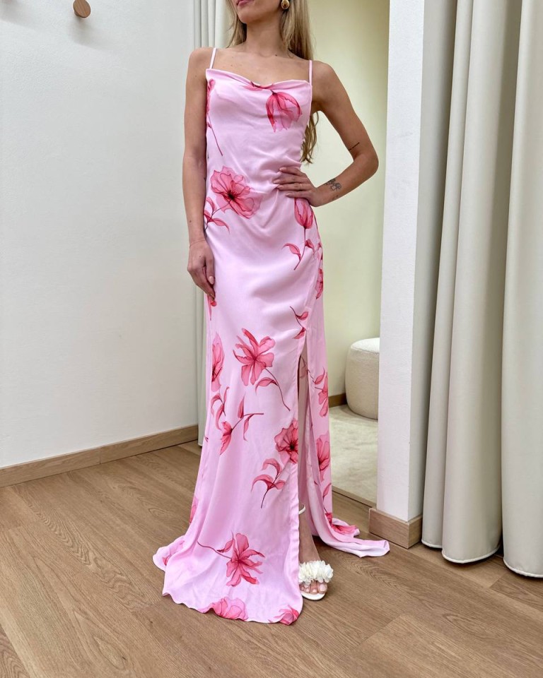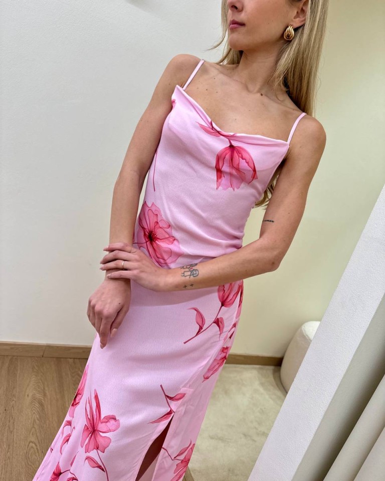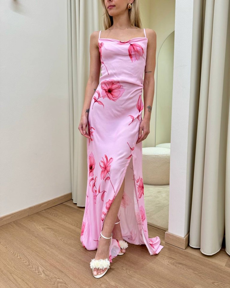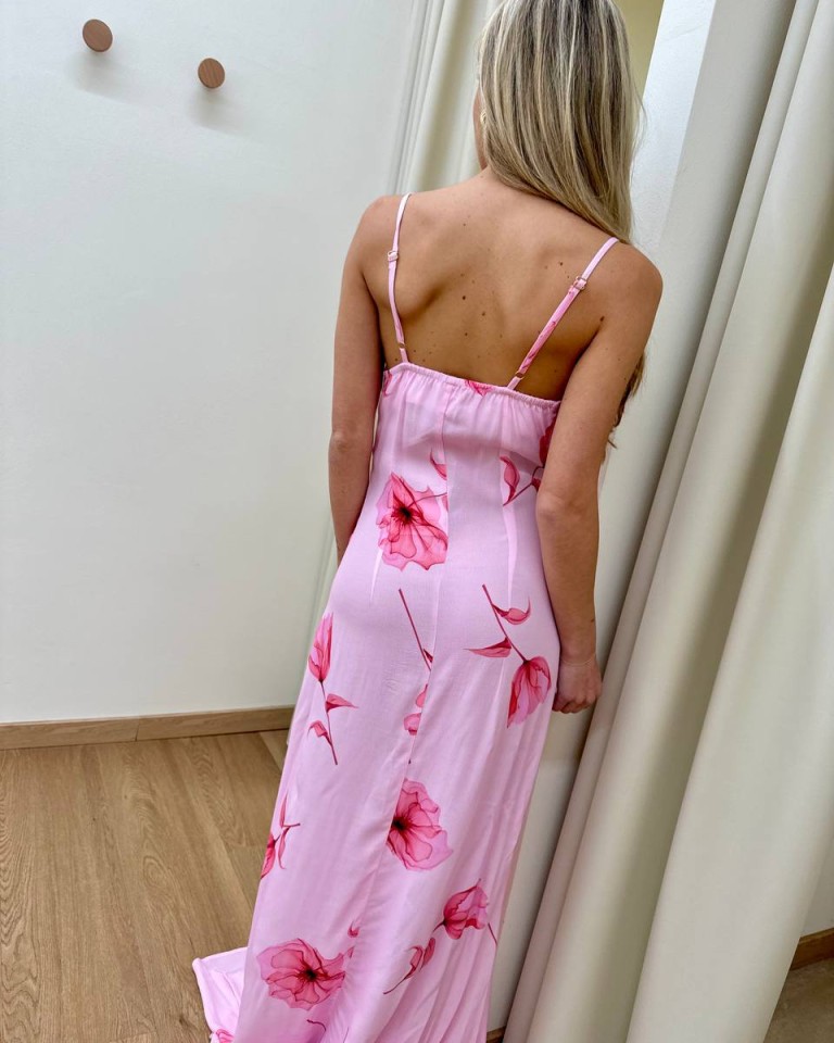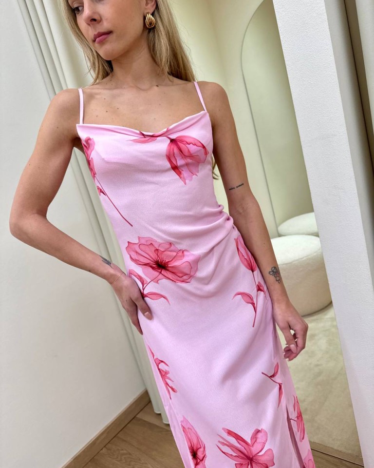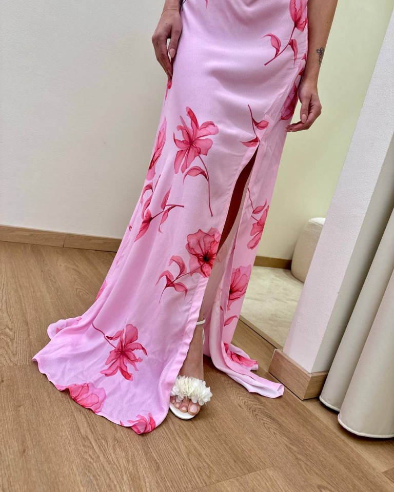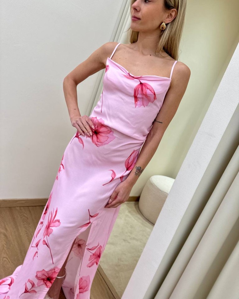 Vestito in crepe di viscosa rosa chiaro con stampa fiori, modello lungo con spacco, scollo dritto e spallini sottili regolabili, drappeggiato in vita, chiusura con zip invisibile laterale. Vestibilità aderente.