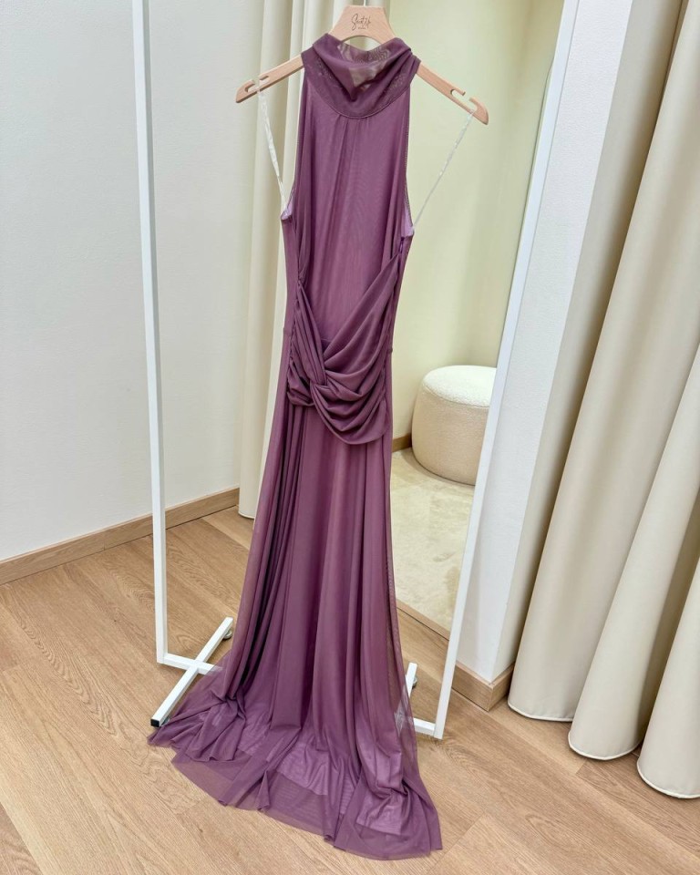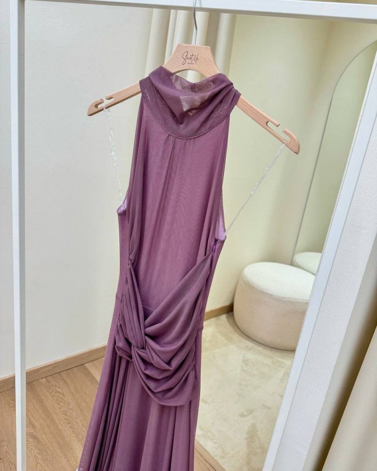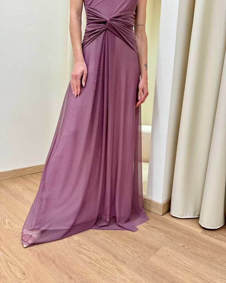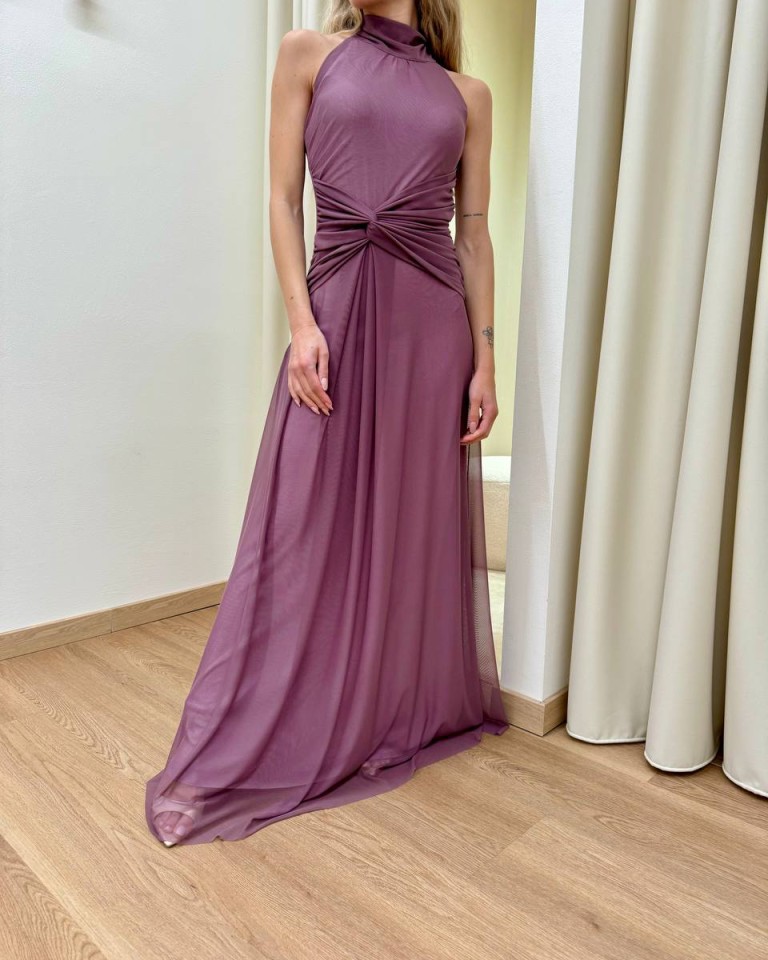 Vestito color melanzana, modello lungo e aderente sul busto, scollo all’americana con allacciatura dietro, effetto nodo in vita, zip invisibile sul fianco. Vestibilità aderente elasticizzata.