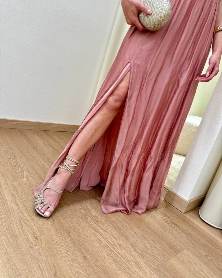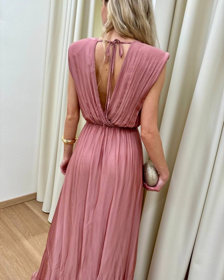 Vestito color rosa antico, modello lungo e leggero, dritto con scollo a V, spalline imbottite e arricciate, vita con elastico e arricciatura, schiena scoperta e chiusura con nastro, gonna con spacco laterale. Vestibilità regolare.