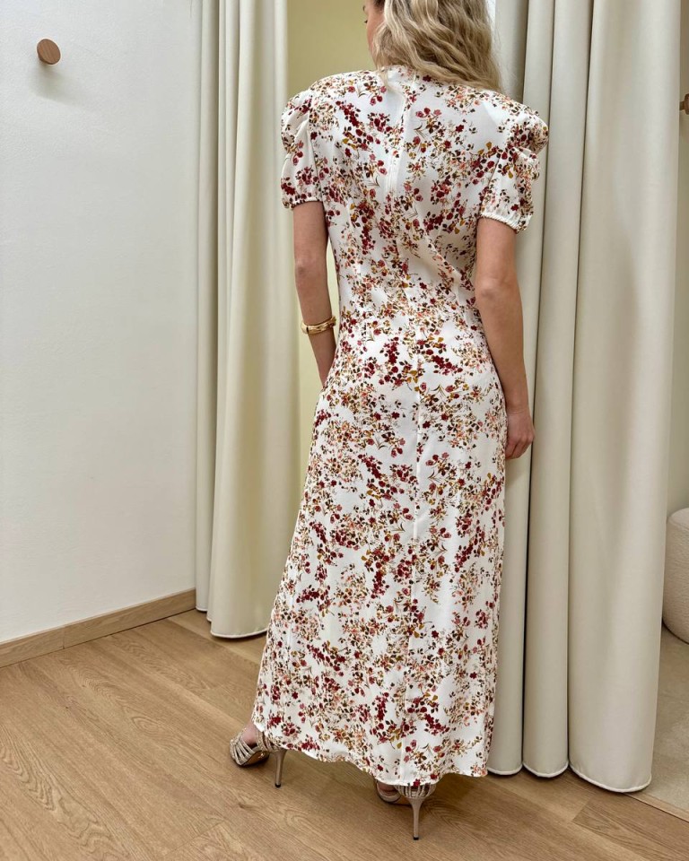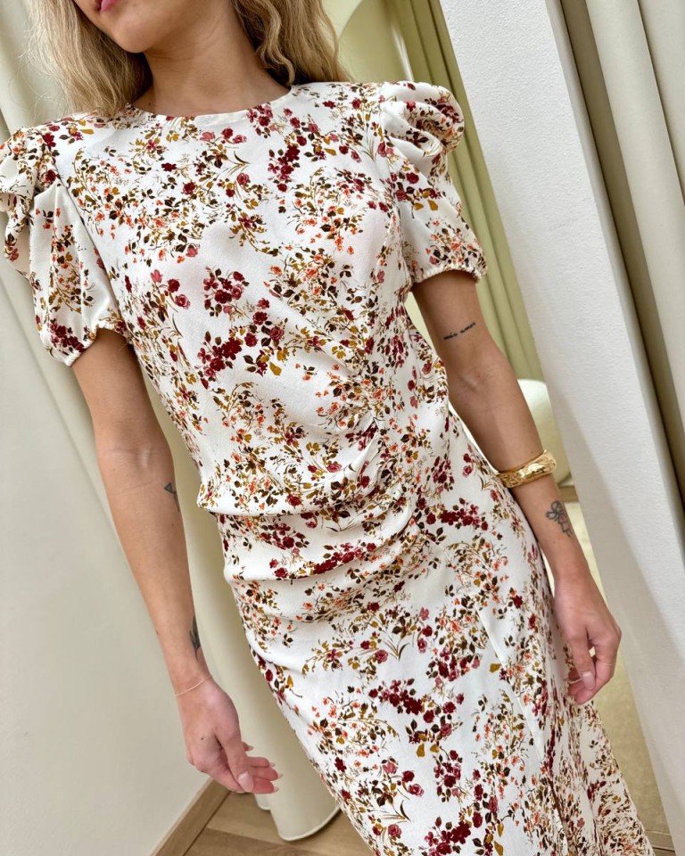 Vestito burro con stampa floreale, modello midi girocollo con maniche corte arricciate e spalline imbottite, arricciatura in vita sul davanti, spacco laterale, chiusura con zip sul retro. Vestibilità regolare.
