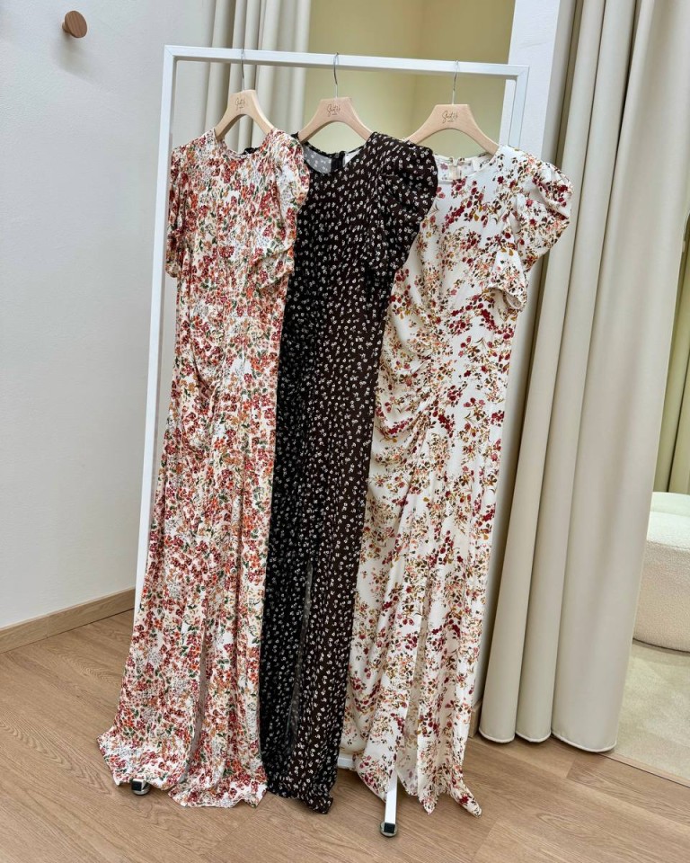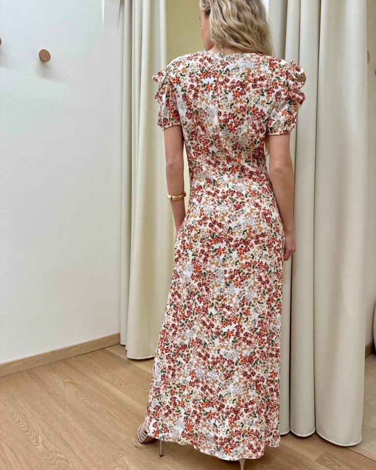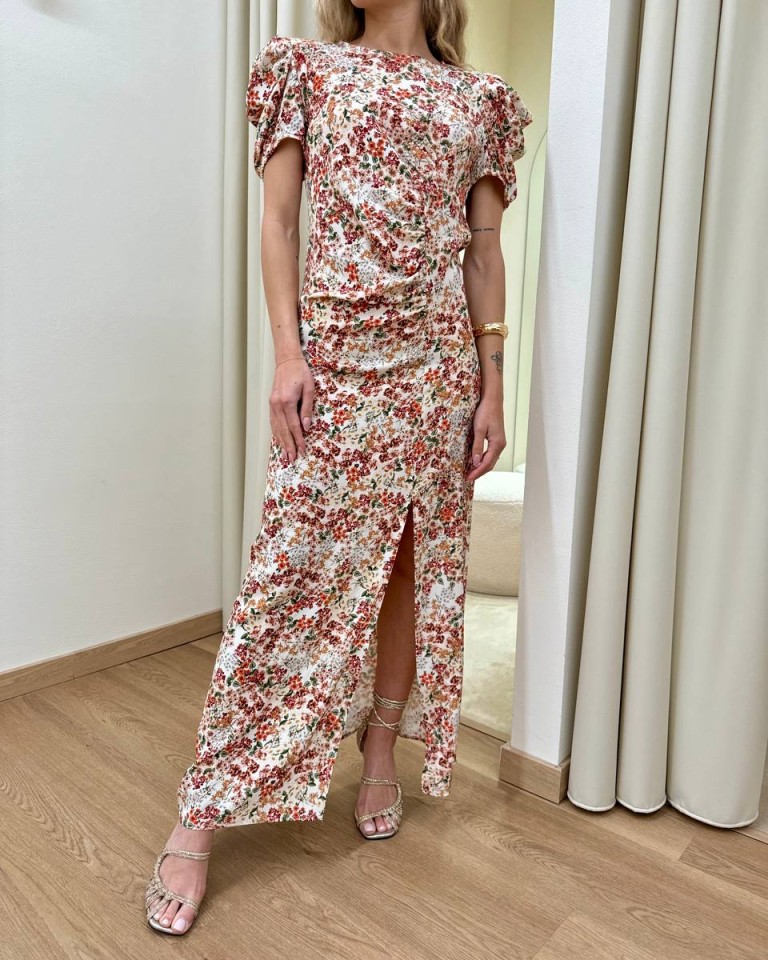 Vestito burro con stampa floreale sui toni dell’arancio, modello midi girocollo con maniche corte arricciate e spalline imbottite, arricciatura in vita sul davanti, spacco laterale, chiusura con zip sul retro. Vestibilità regolare.