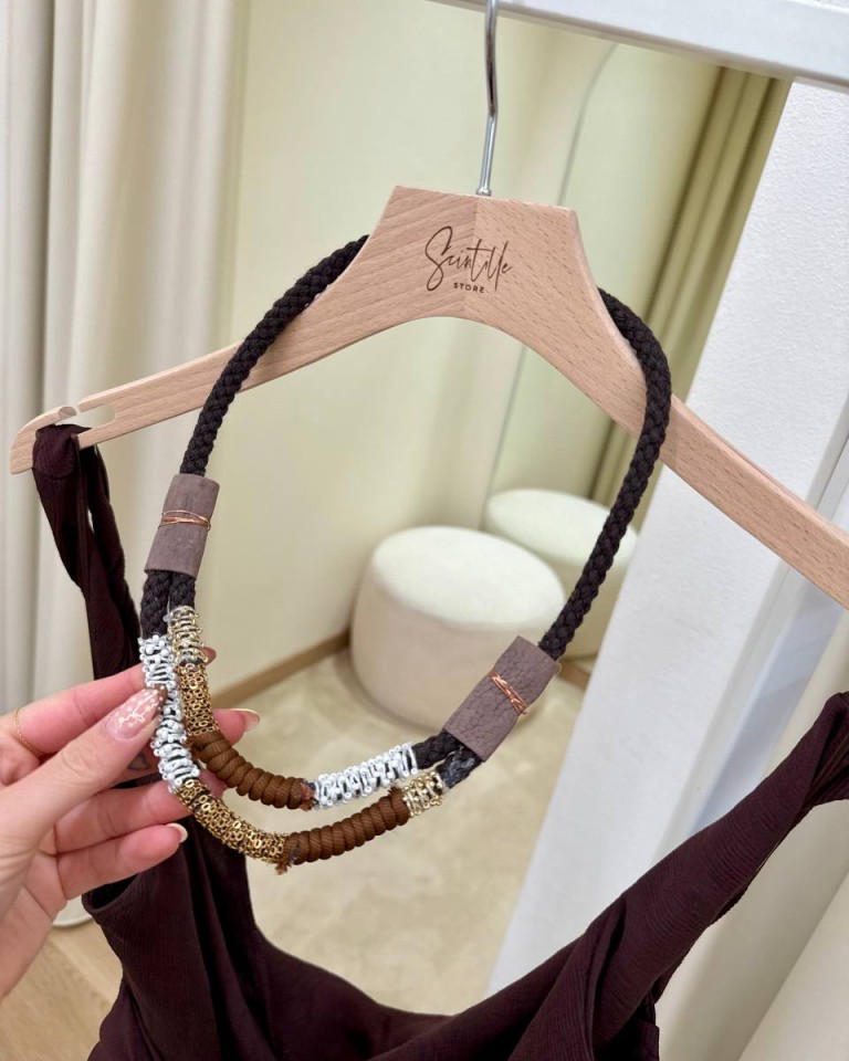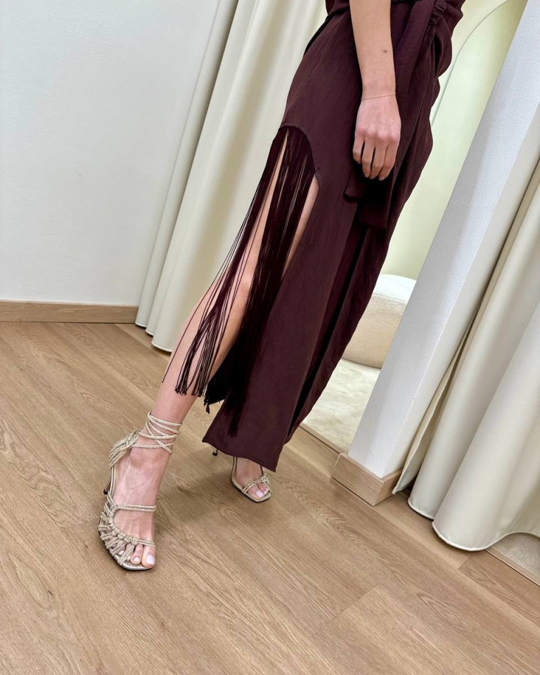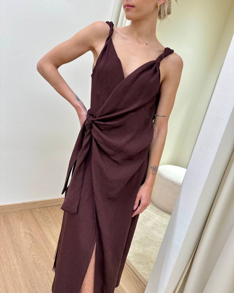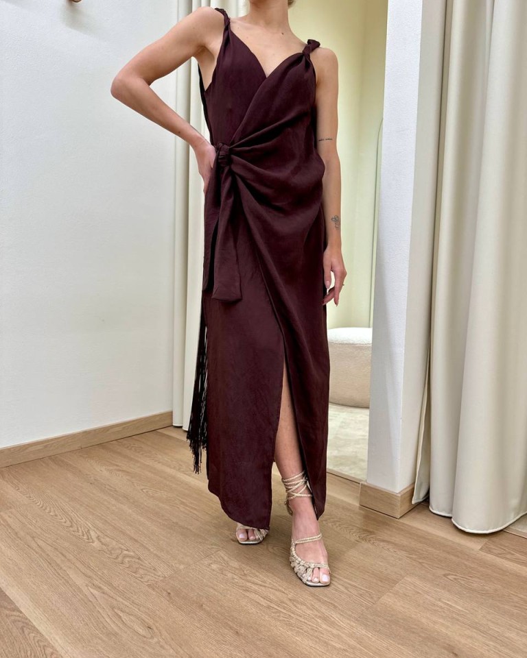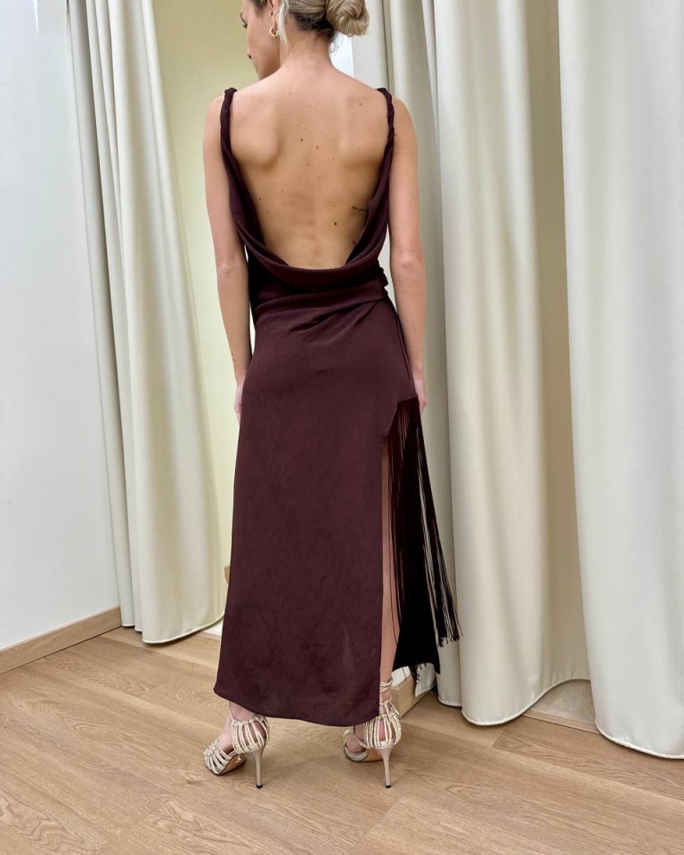 Vestito color moro, modello midi con scollo a V, gonna a portafoglio con spacco laterale e frange, scollo profondo sul dietro, chiusura con nodo laterale, collana abbinata. Vestibilità regolare.