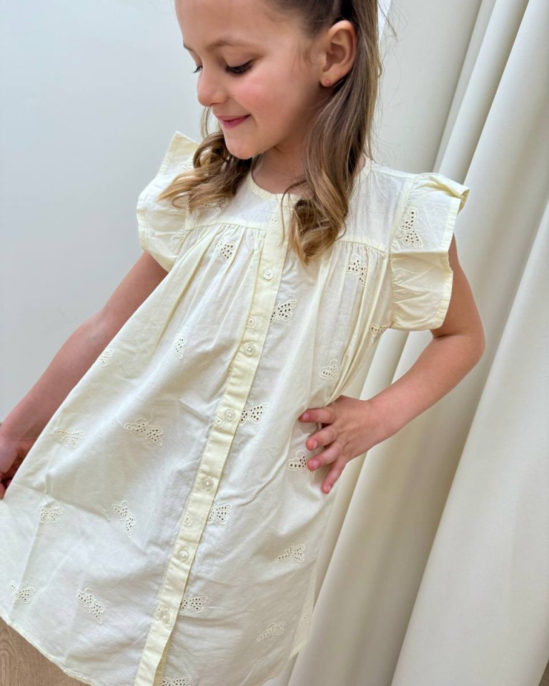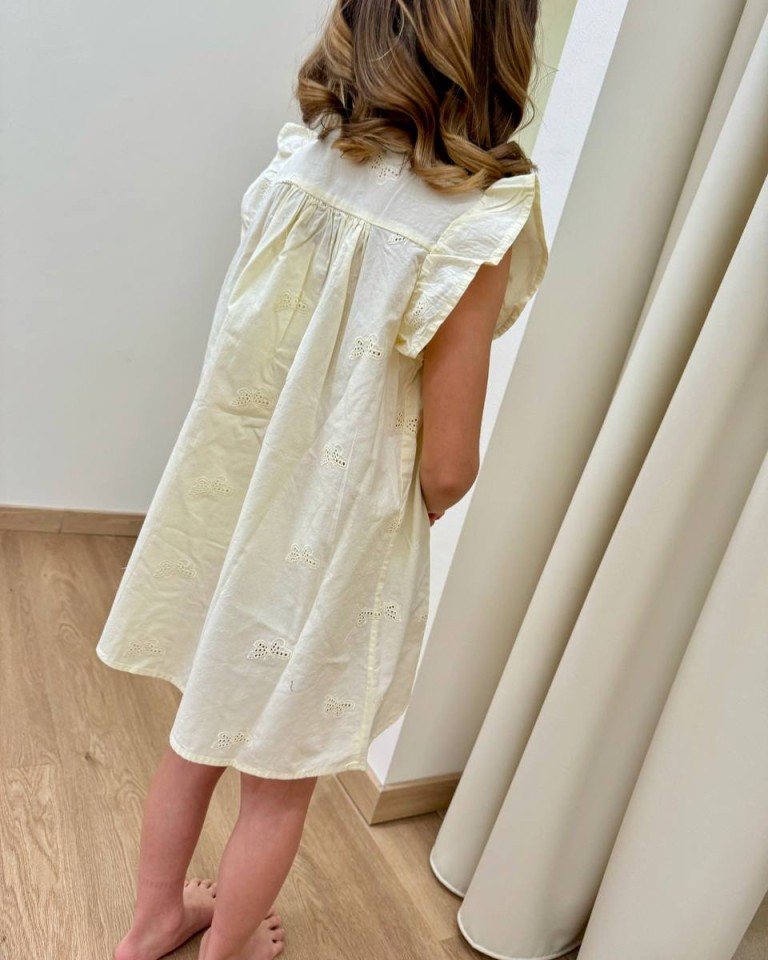 Vestito color giallo pastello con ricami farfalle, modello a trapezio, girocollo, smanicato con rouches sulle spalle, abbottonatura davanti. Vestibilità ampia.
